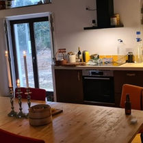 Keuken met inductiekookplaat, oven, nespresso-apparaat, staafmixer, waterkoker en tal van pannen, schalen, servies, bestek etc.
